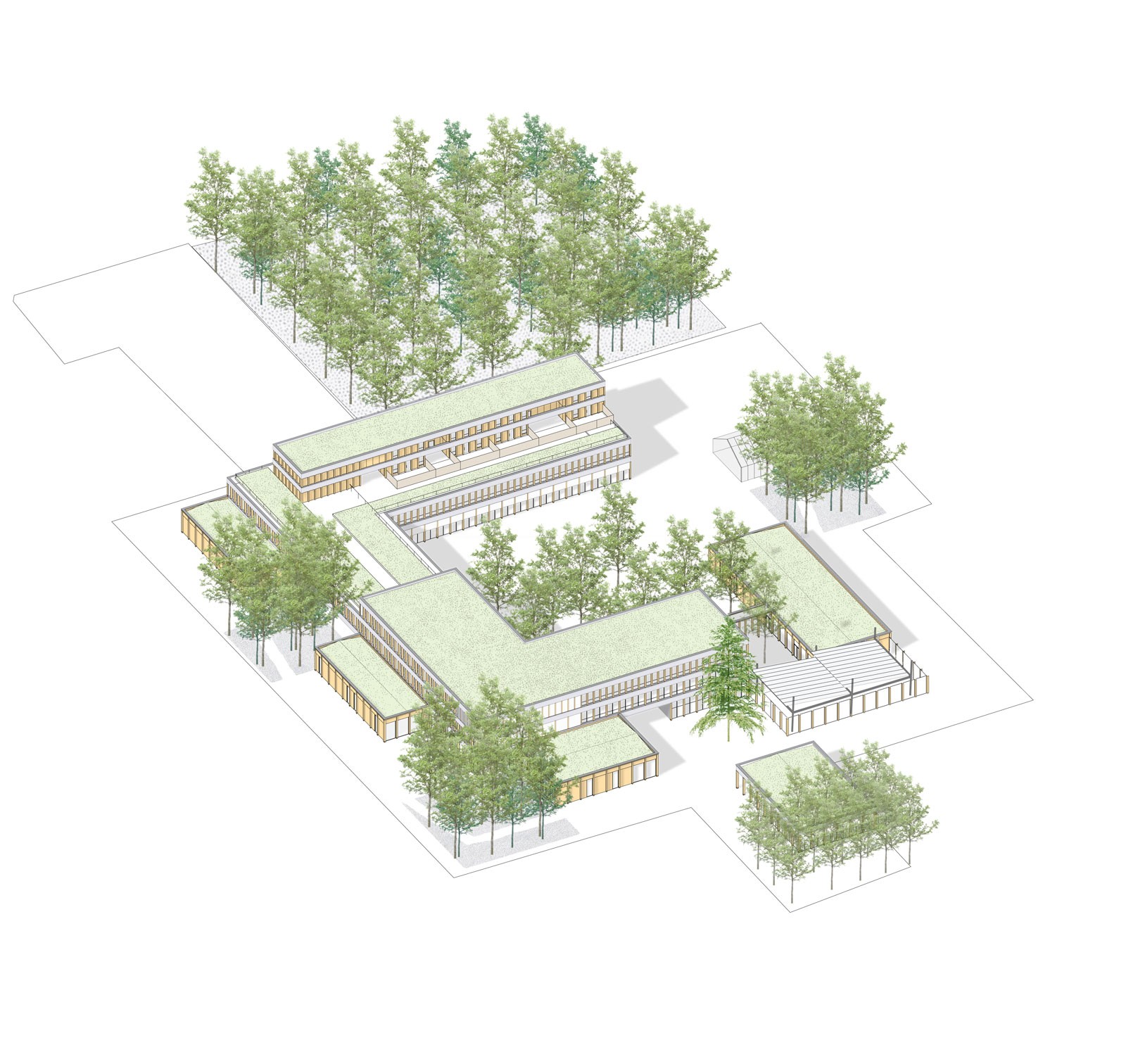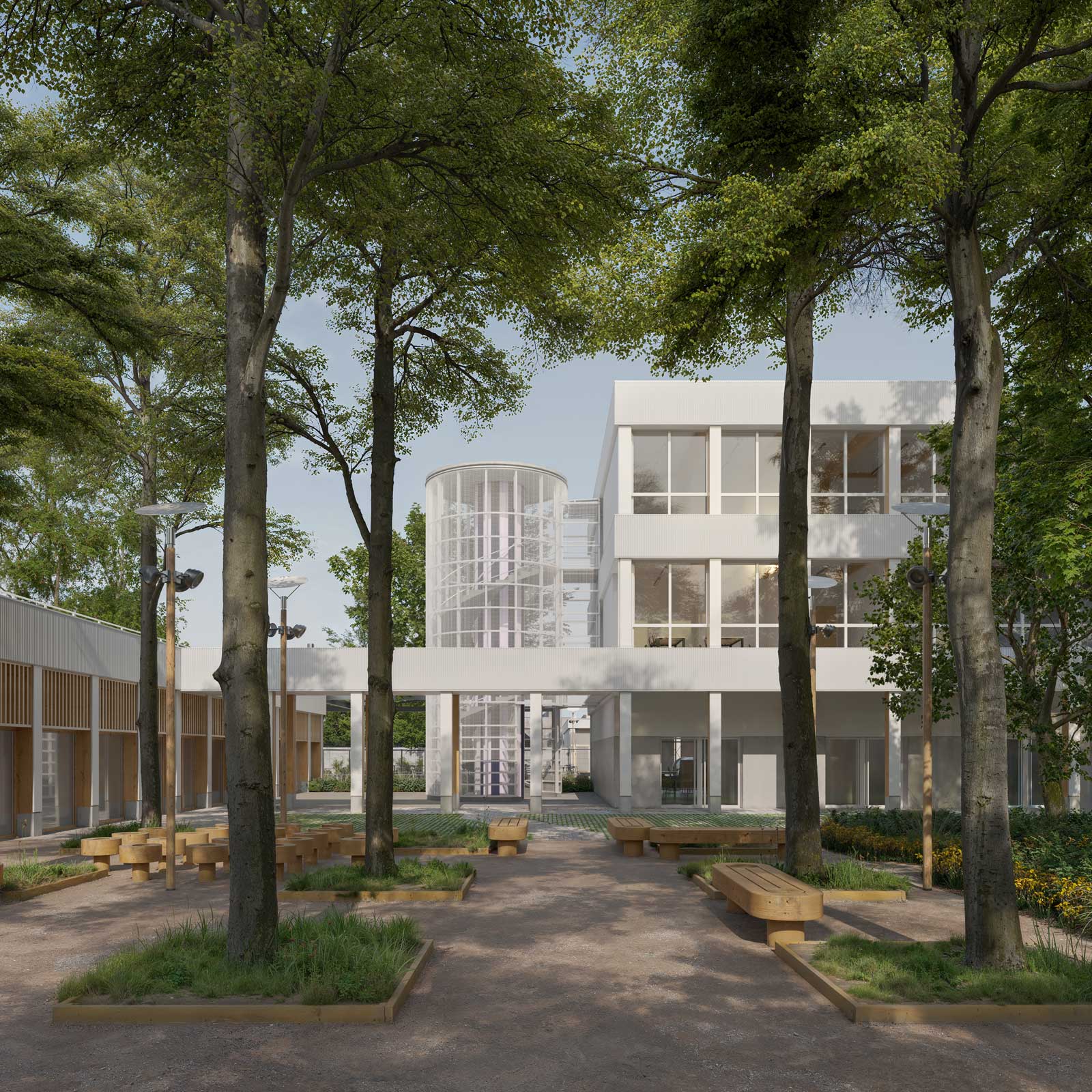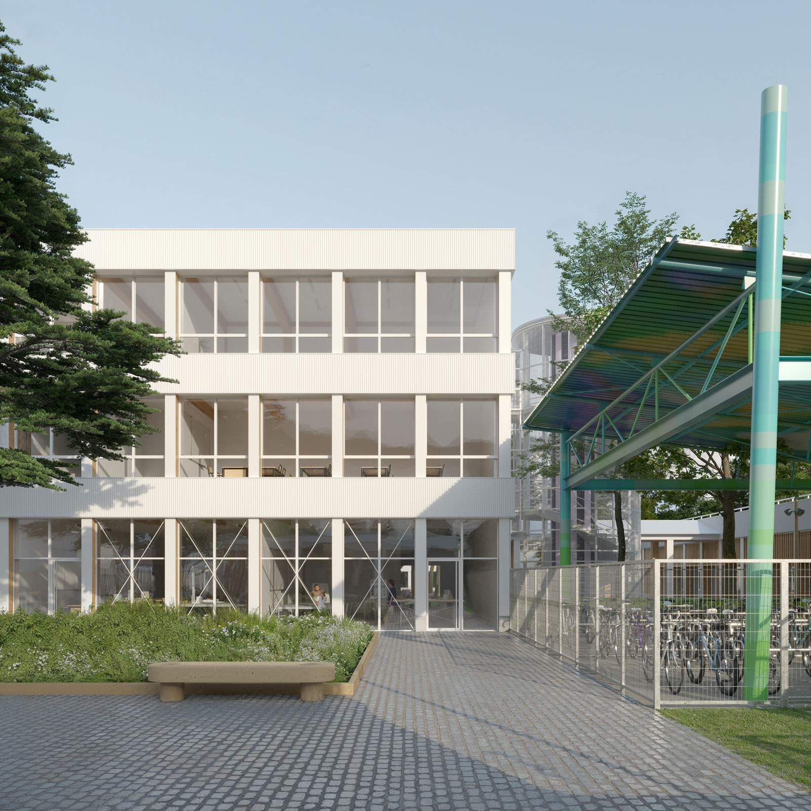Démolition d’un ensemble existant de bâtiment formant le collège et construction d’un bâtiment unique rassemblant les espaces de travail dont les ateliers, les espaces de restauration ainsi que des logements de fonctions. Une forêt nourricière prend place à côté de l’établissement.